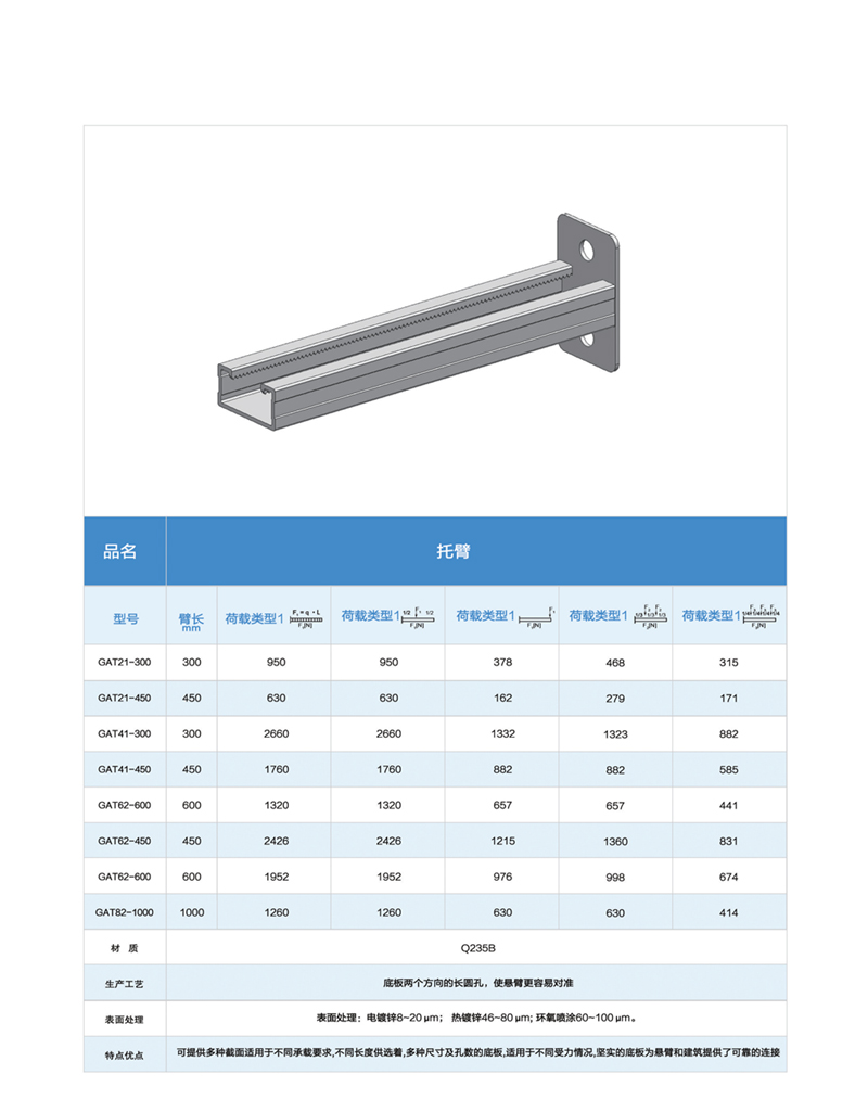 托臂支架是支撑电缆桥架和电缆的主要部件,它由立柱、立柱底座、托臂等组成。我厂生产的托臂支架是根据日本、德国 的同类产品设计而成;它具有结构简单、重量轻、成本低、强度大、造型美等优点,可满足不同环境条件(工艺管道架上、楼板下、墙壁上、电缆沟内)安装成不同形式(悬吊式、直立式、侧壁式、单边、多边和多层)等的需要。 电缆桥架如需多层重载荷吊装时,要尽量采取双边敷设、避免偏载过大。 托臂支架部分其表面处理有电镀锌、热度锌、喷漆、喷塑四种。